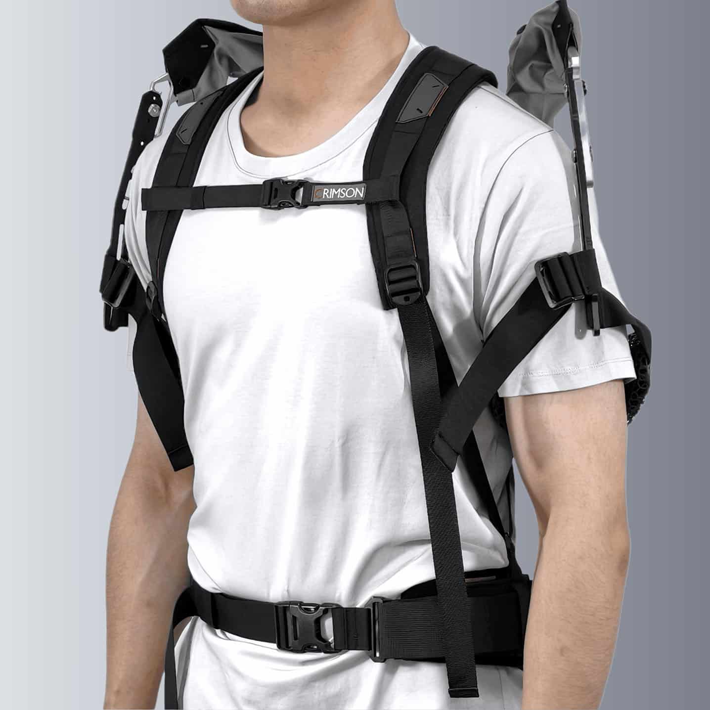 The CDYS is a wearable shoulder support exoskeleton for tasks that require continuous or repetitive arm lifting. The design intent is to transfer the weight of the CDYS to the belt at the waist to avoid loading the spine. Visit the official product website for a wealth of additional information. Other notable design choices include a fusion of textile + mechanism; proprietary “CrimsonFR” elastic bands; suspended arm sleeve design; mechanical torque control, synchronized adjustment belt for on-body fit adjustment; modular wearable parts designed to be disassembled for cleaning; carrying bag included; multiple arm-sleeve options (including flexible mesh 3DAS + textile sleeves)