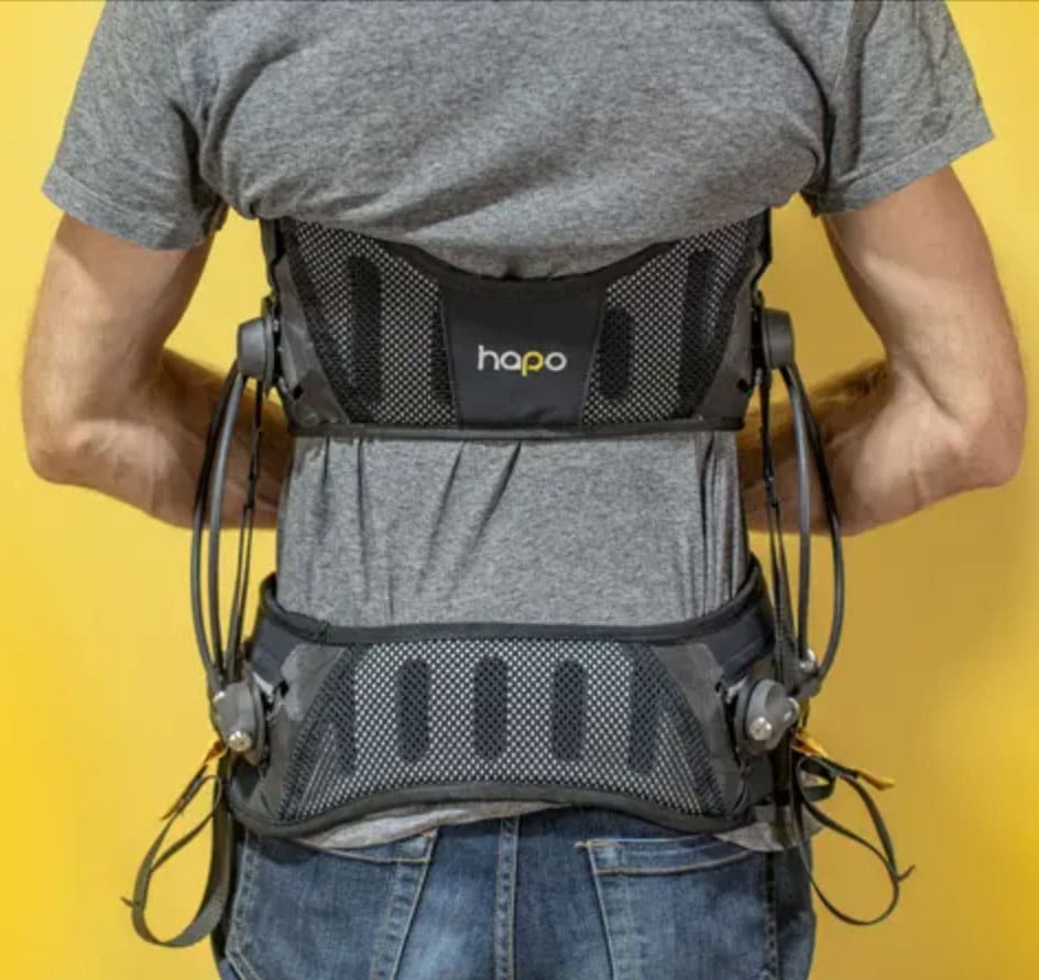 Hapo BR (by Hapo) is a passive back-support exoskeleton designed to relieve lumbar discomfort in work and daily-life situations. It uses a spring-rod antigravity system to decompress the spine and redistribute part of the trunk load toward the hips, helping reduce back stiffness and fatigue while preserving freedom of movement.