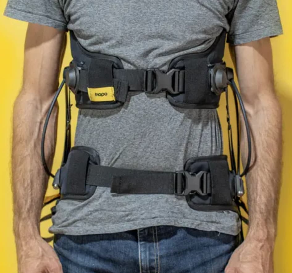 The passive antigravity system operates without batteries, maintaining mobility and muscle activity while offering adjustable assistance that can be tensioned or released as needed. Hapo BR weighs approximately 0.89–1.1 kg (1.95–2.43 lb) depending on size, features breathable, washable textiles, and can be donned in under 1 minute. Nine size combinations (three high-waist and three low-waist belts) support a wide range of body types, making it suitable for diverse professional environments where back fatigue and stiffness are a concern (the spring elements are completely detachable from the belts).